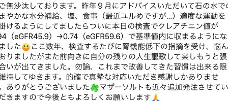 「ご無沙汰しております。昨年9月にアドバイスいただいて石の水でのこまやかな水分補給、塩、食事(最近ユルめですが…)適度な運動を心掛けるようにしてましたら、ついに本日の検査でクレアチニン値が0.94(eGFR45.9)→0.74(eGFR59.6)で基準値内に収まるようになりました