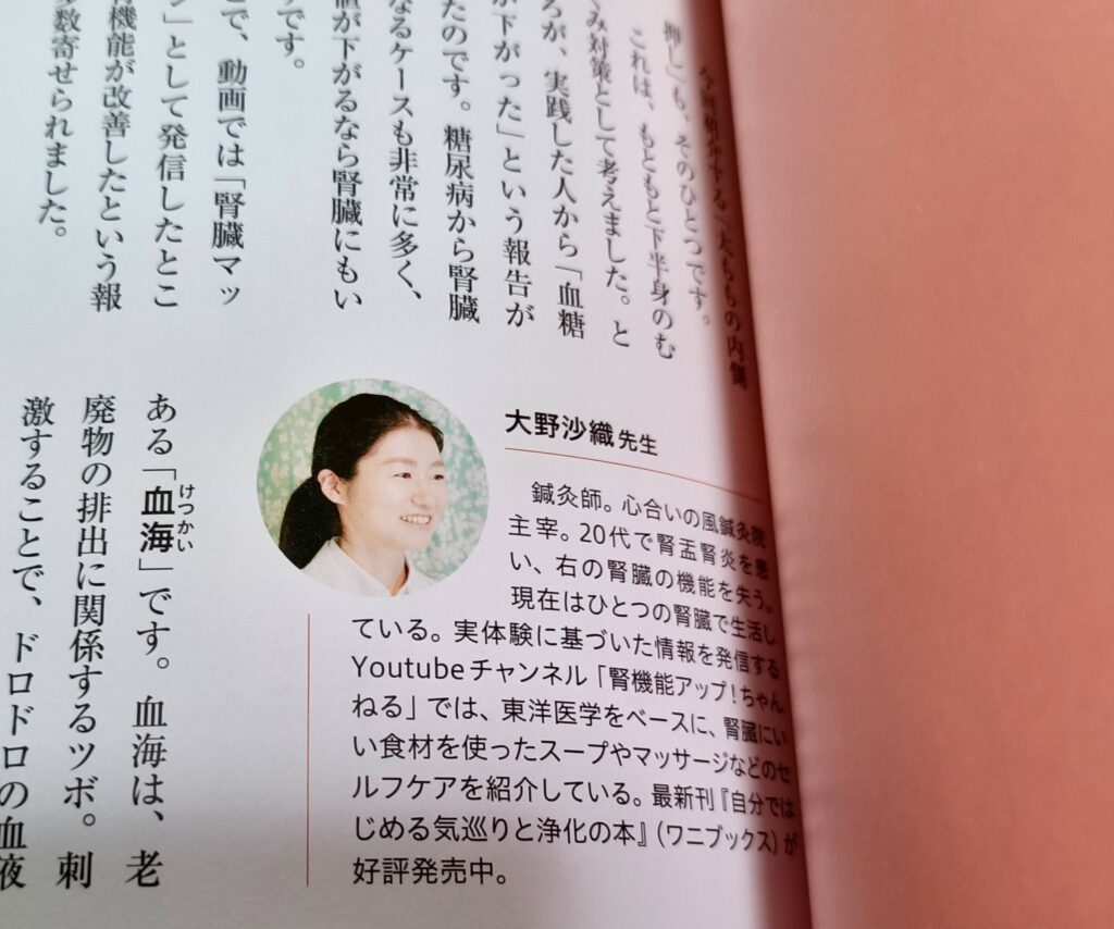 ブティック社様のムック本で腎臓特集があり、その中で腎臓こすりと、腎臓マッサージをご紹介するページに取り上げていただけました、嬉しいです^^ありがとうございます。他にも腎臓に関する情報が盛りだくさんの雑誌です。